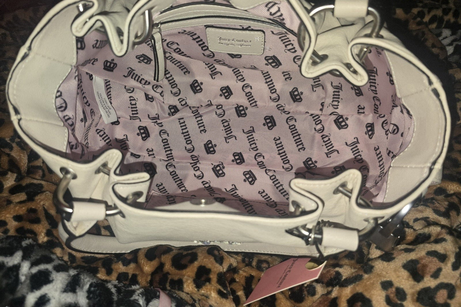 Designed with both fashion and function in mind, this satchel includes a secure magnetic closure, a soft pink interior lining, and convenient inner pockets for easy organization. The faux‑leather handle and strap offer comfortable wear, while the rhinestone charm adds the perfect touch of Juicy bling. Finished with the iconic Juicy Couture logo, this bag is ideal for anyone looking to elevate their wardrobe with a chic, eye‑catching accessory.