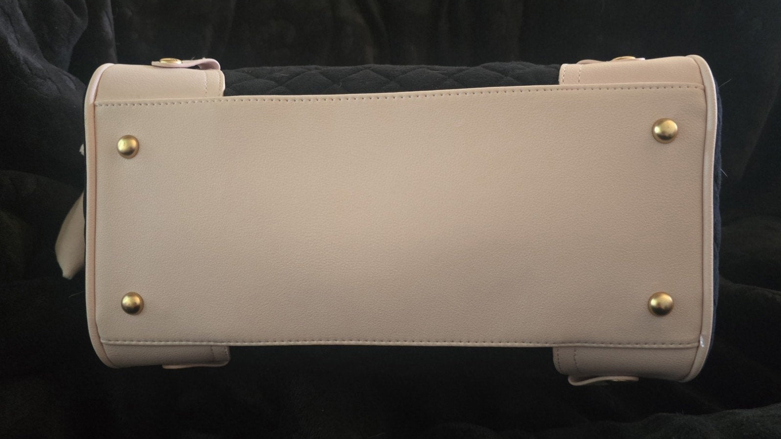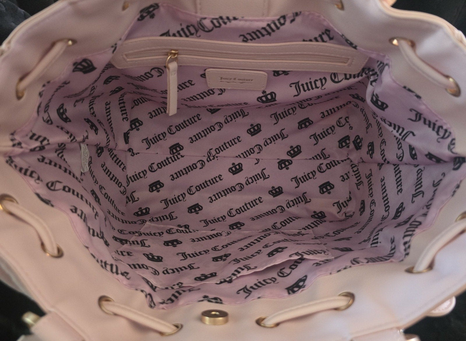 Pink double handles add a playful contrast, while gold‑plated hardware and a charming bow accent elevate the design with signature Juicy flair. The spacious interior is lined in Juicy’s classic pink fabric and includes built‑in pockets for effortless organization. A secure magnetic snap closure keeps your essentials safe while maintaining easy access on the go.