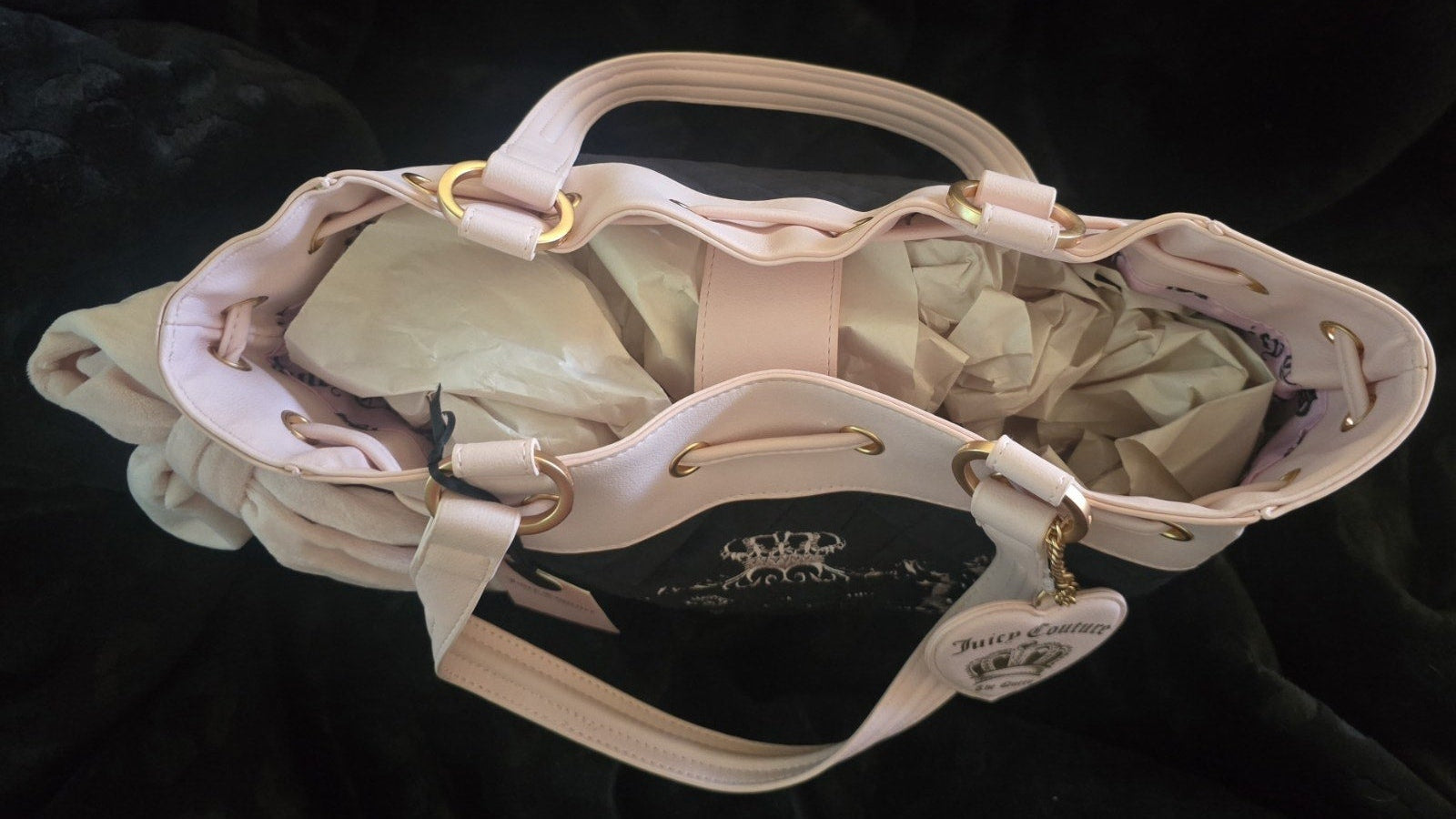 The Black Liquorice colorway is effortlessly chic—bold, versatile, and perfect for elevating any outfit. The contrast of black velour with pink handles and gold hardware creates a designer look that turns heads. Whether you're styling a Y2K revival fit or adding a touch of Juicy nostalgia to your everyday wardrobe, this tote delivers iconic early‑2000s energy with modern sophistication.