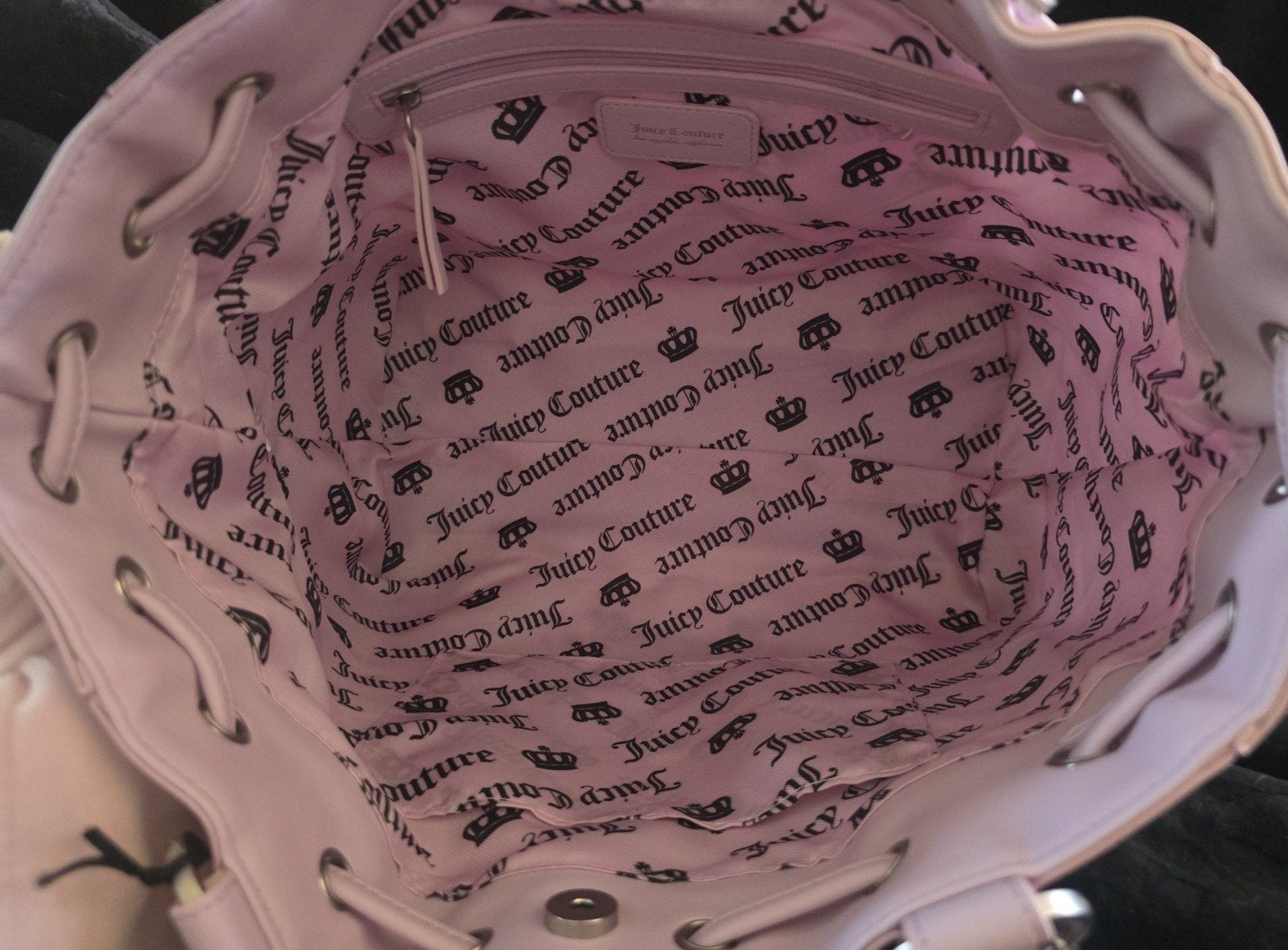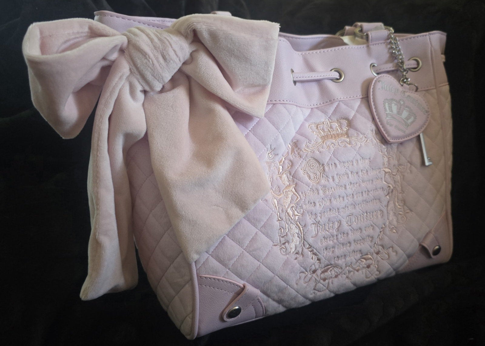 The design features double lilac handles, a secure magnetic snap closure, and a spacious interior with built‑in pockets for easy organization. Silver‑tone hardware, designer logo detailing, and a charming Juicy bag accessory complete the look, giving it that fairytale‑inspired aesthetic collectors adore.